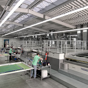 Die schiere Größe ist ebenfalls beeindruckend: Im Siebdruck sind Formate mit einer Größe von bis zu 6,1 Quadratmetern möglich. Die Mehrfarblinien bedrucken Flächen bis maximal 2m × 3,05m; die Einfarbenmaschinen bis zu 4m × 1,50m. >>